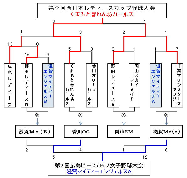 | 新宮女子野球部 | 0-7● | 1-11● | 0-7● | 0-9● | 7-18● | 0 | 5 | 6 | |