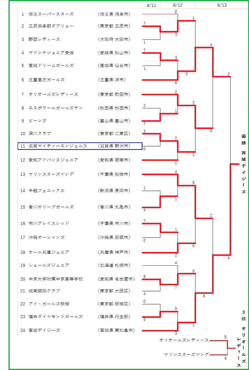 | 野田レディース | 4-9● | 0-2● | 5-2○ | 11-1○ | 8-1○ | 3 | 2 | 3 | |